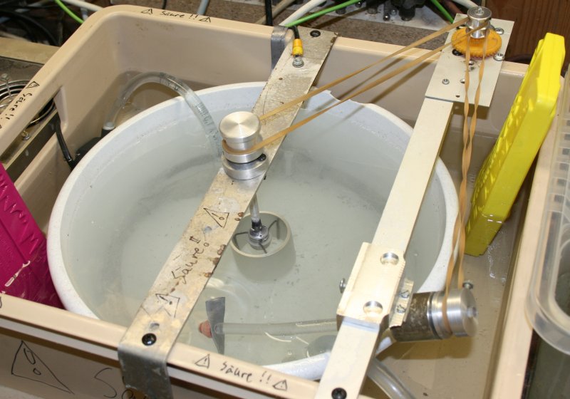 Weiterhin habe ich einen 'Aussenborder' montiert welcher vom gleichen Motor über einen zweiten Riemen angetrieben wird und das Bad langsam umwälzt (Strömung entgegen der Drehrichtung des Bauteils). Welle ist ein PVC-Stab mit einem M6-Zapfen am Ende, 'Schiffsschraube' einfach ein durchbohrter Streifen Walzblei welcher entsprechend gebogen und mit einer M6-Alumutter festgesetzt wurde.