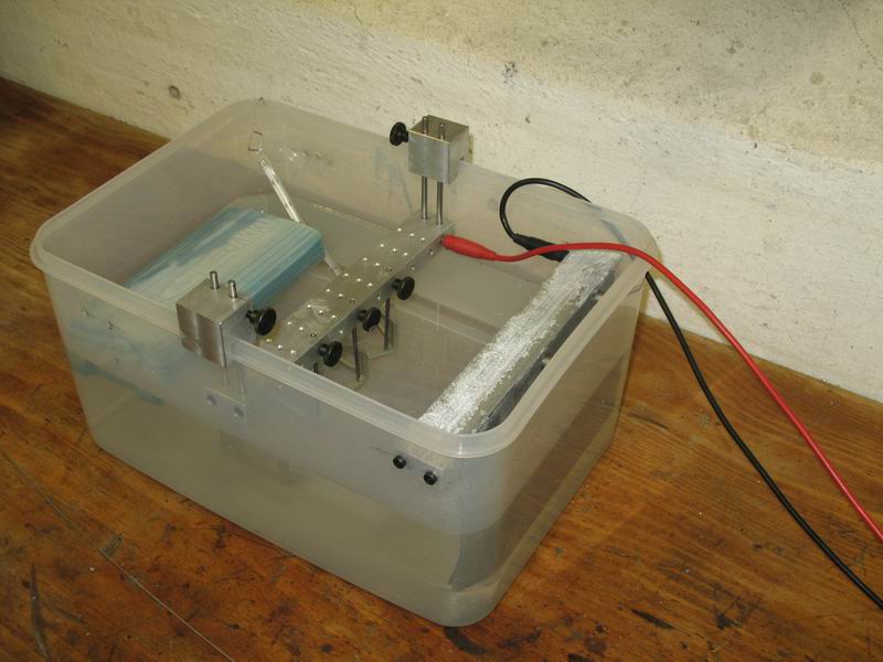 Dann habe ich mir eine luftdicht verschließbare Plastikwanne genommen und eine kleine Halterung für die Teile gemacht. Ich kann darin die verschiedensten Teile spannen, die Klammern bestehen aus 2.5 mm Titandraht.