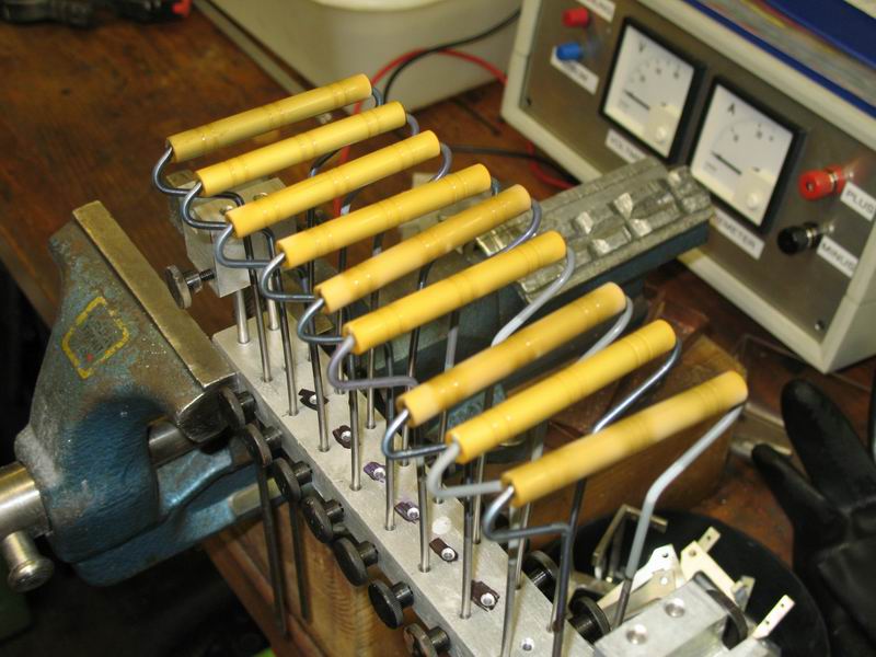 Der erste Versuch ging dann prompt schief, da ich mich gewaltig in der Amperezahl verrechnet hatte und statt der benötigten 1,9 Ampere doch glatte 6 Ampere bei 60 Minuten absolviert habe. Die Folge war, dass die Teile matt waren und die Farbe teilweise wieder abzuwischen war. Ich denke, dass mit der richtigen Stromstärke das Ergebnis passen wird. Ich schreibs hier rein wenn ich es weiß.