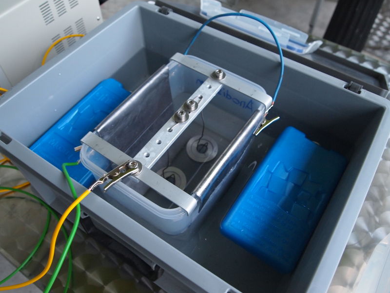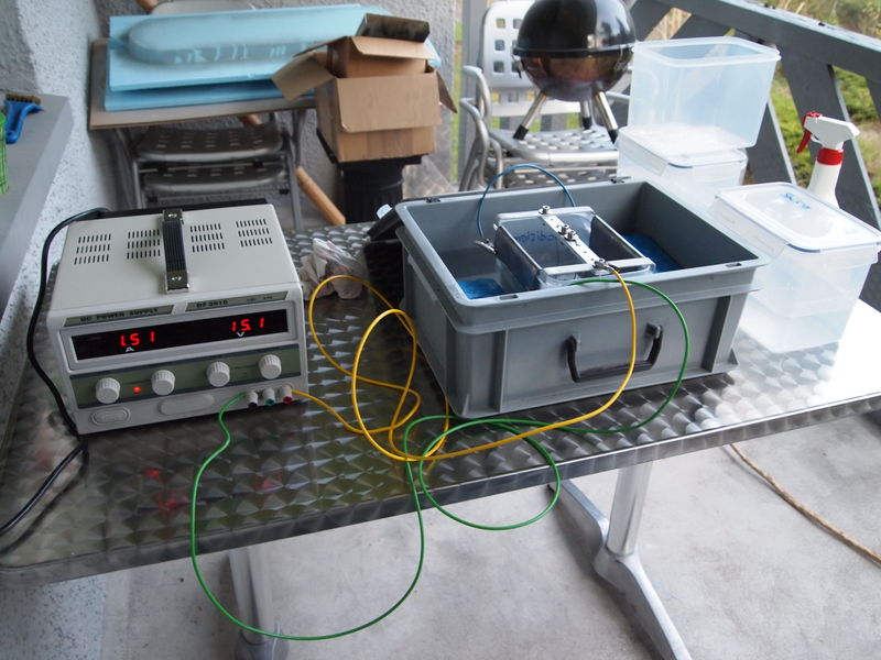 So, unten meine Anodisierstation mit Netzteil 10A-30V, sowie Bad im Kühlbad. Zum Kühlen benutze ich Accus aus dem Tiefkühler -18°C nach Bedarf.