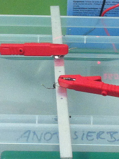 2. während des Anodisierungs-Vorgangs entsteht am Werkstück an der Stelle, an der es aus dem Bad heraus schaut eine Art weiße Kruste, die sich jedoch nach dem Anodisieren unter fliesendem Wasser fast vollständig abspülen lässt.