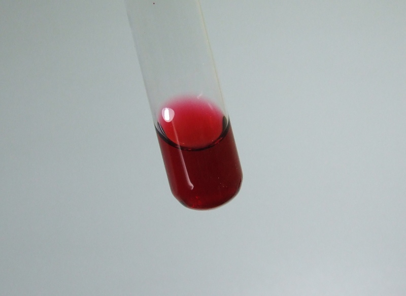 Das Reagenzglas mit 2ml Flüssigkeit enthielt nur noch Spuren von Bordeauxrot (1,2mg) und hat bereits in etwa die Sättigung des "Problembades".