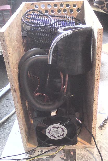Ich habe für mein kleines Anodisierbad mit 4L Schwefelsäure eine kleine Kompressorkühlung gebaut. Sie hat etwa 140W Kälteleistung und ist für die Badgrösse gerade ausreichend. Dazu habe ich einen Wasserkühler zerlegt (die Dinger, die in Büros stehen, mit dem grossen Kanister obendrauf). Man muss natürlich aufpassen, das man den Kreislauf nicht öffnet und das Kältemittel entweicht.