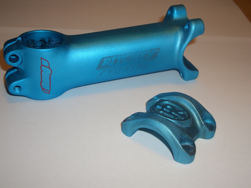 Nächstes Mal mit warmer Farblösung arbeiten (die wurde immer wieder kalt zwischendurch) und größere Gefäße (!), s. Sattelstütze (da sieht man rel. gut, dass sie 2 x halb/halb eloxiert und gefärbt wurde - kann man ja wieder). Die Teile habe ich im Durchschnitt ca. 25-30 mins hängen gehabt, die kleineren entsprechend kürzer.