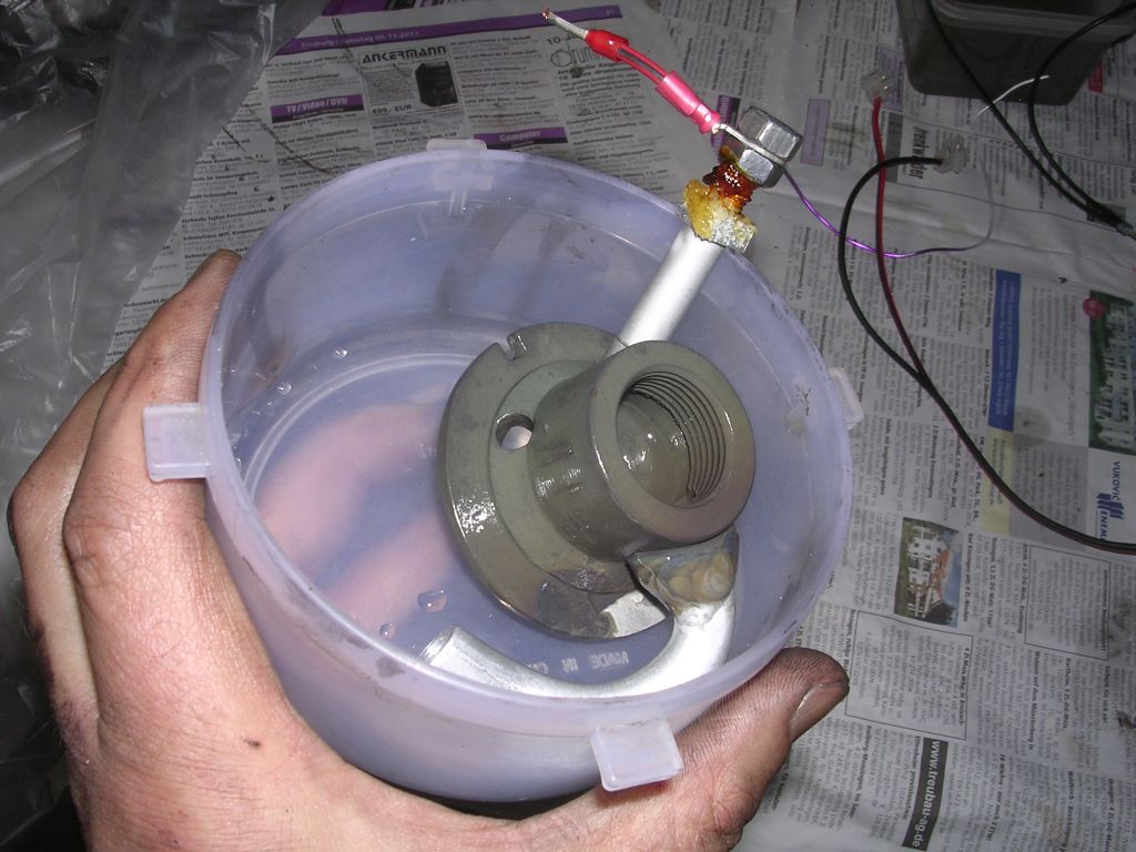 Inspiriert von deiner Kontaktierung selber gleich Alu-Gewindestangen gezaubert (zu kurz, wie sich später herausstellte) und nochmals die ganze Prozedur. Abbeizen, Anhängen, ins Bad und Strom frei...