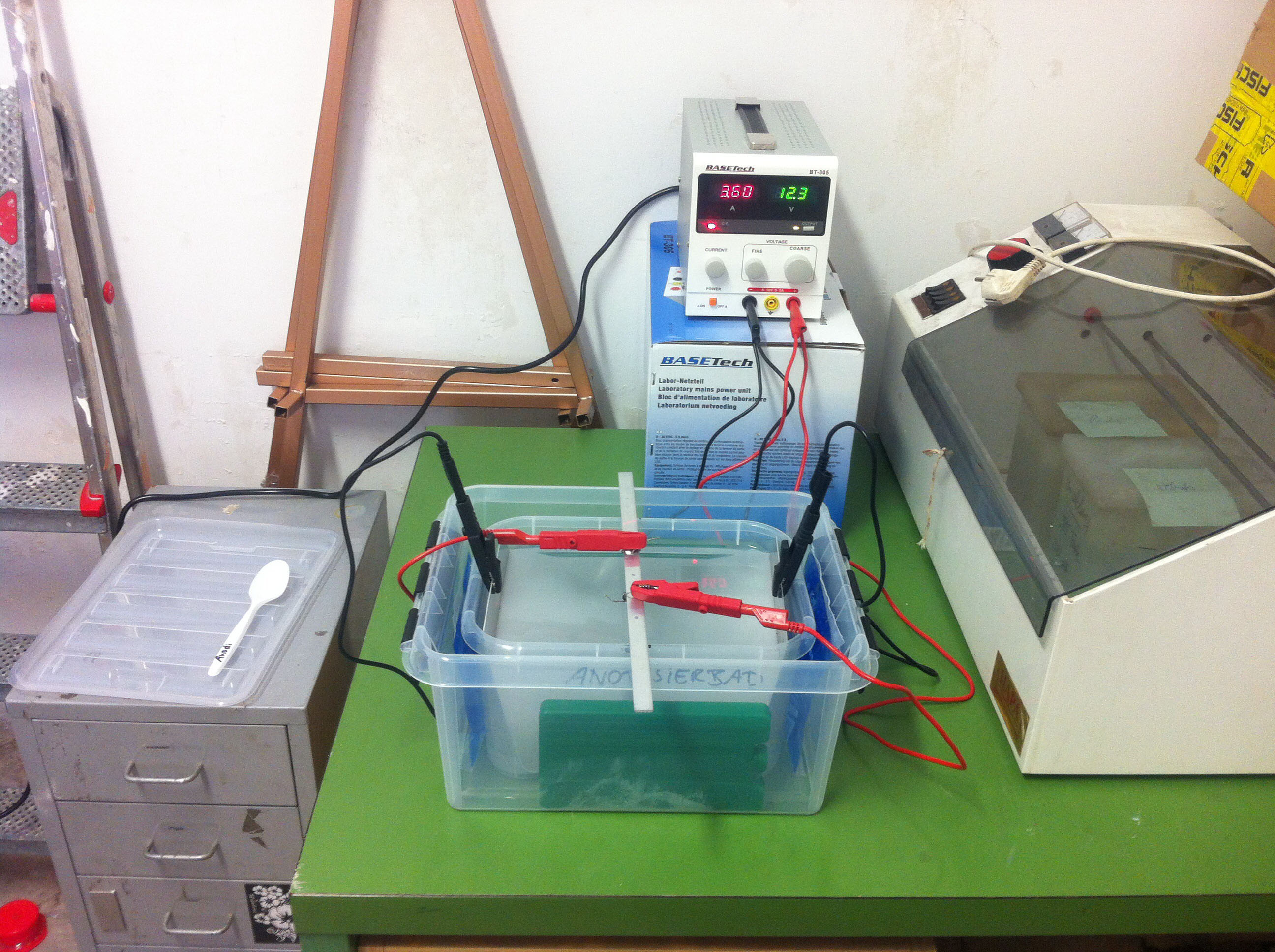 PS: Mit einem Glasbecken dass in einer Gefriertruhe runter gekühlt wird auf 7°C kann man komplett ohne Kühlakkus 60-70min eloxieren und es steigt