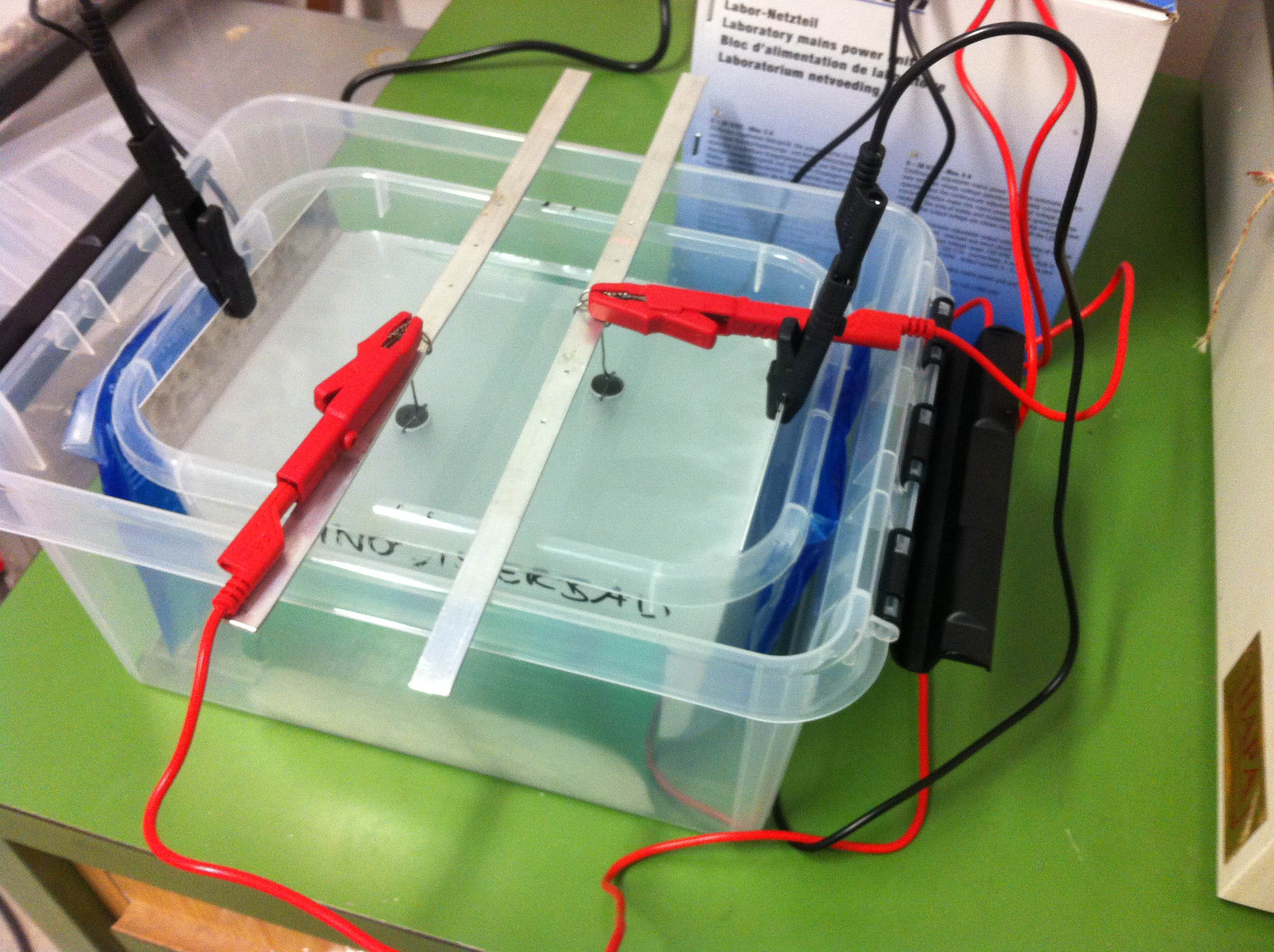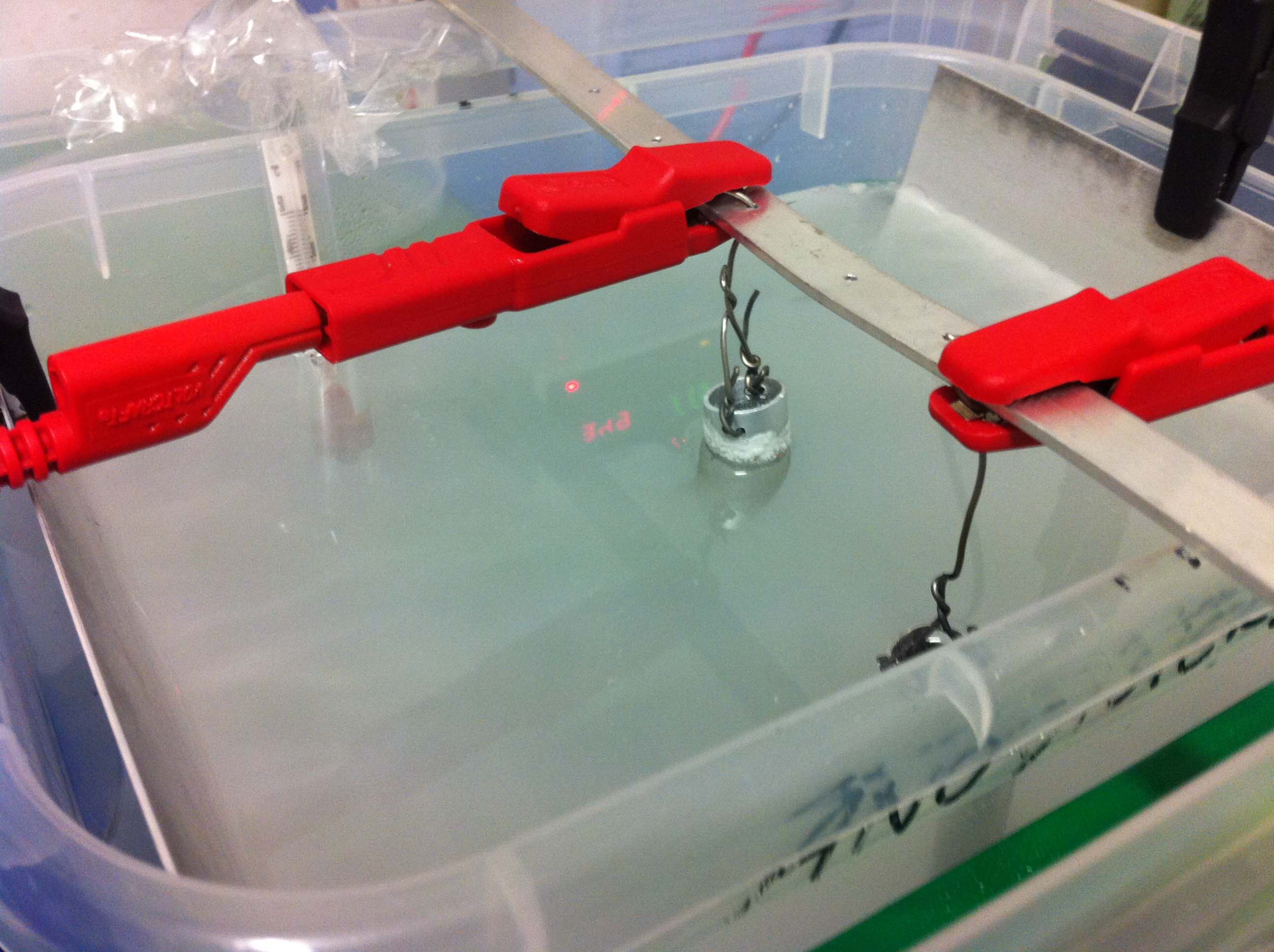 2. während des Anodisierungs-Vorgangs entsteht am Werkstück an der Stelle, an der es aus dem Bad heraus schaut eine Art weiße Kruste, die sich jedoch nach dem Anodisieren unter fliesendem Wasser fast vollständig abspülen lässt.
