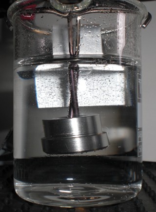 Als kleine Ergänzung noch mein 'Mini-Eloxierbad', das Ganze befindet sich in einem 50 ml Becherglas: