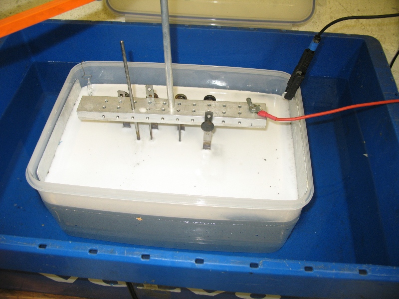 Die Schaumerzeugung selbst sollte dann automatisch durch die aufsteigenden Gasblasen an Anode und Kathode erfolgen. Wenn die Ströme dafür zu gering sind, sollte man durch Lufteinblasung nachhelfen - am einfachsten mit Hilfe eines sog. 'Ausströmers' aus der Aquaristik (sehen aus wie Schaumstoffblöcke - müssen natürlich säurefest sein!), der für sehr kleine Bläschen und entsprechend sehr feinporigen Schaum sorgt. Bei entsprechenden Sicherheitsmaßnahmen kann man natürlich auch die Säure schütteln etc.
