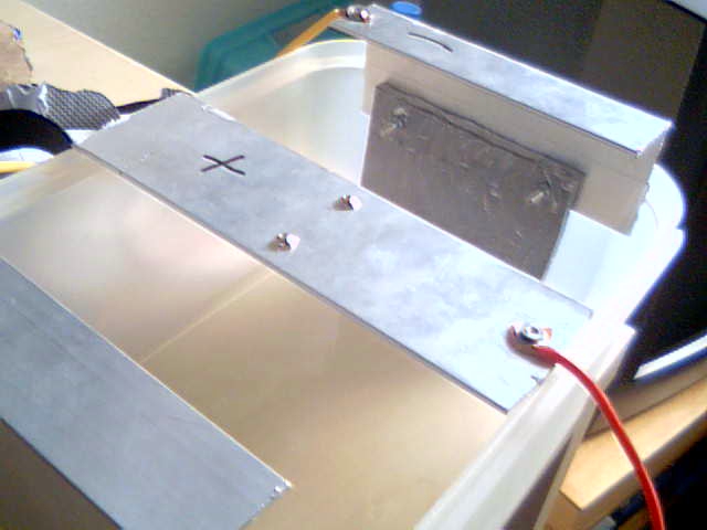 Auf jeder Seite kommt dann eine Bleiplatte, welche mit dem -pol verbunden ist. Die Bleiplatte ist mit m4 schrauben an eine Alubrücke geschraubt. Die Brücke hängt dann über dem Becken. In die Mitte kommt dann eine Weitere Brücke an der der Titandraht und darunter dann das Werkstück im Bad liegend aufgehängt wird.