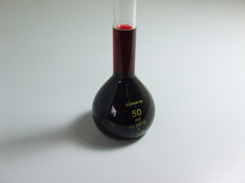 Ich habe im Labor zwei Proben mit Bordeauxrot angefertigt (siehe Bilder). Der 50ml-Messkolben enthält 0,103g Bordeauxrot, die dann etwa 2g/Liter entsprechen - und durch dessen Bauch (etwa 40mm Durchmesser) kann man schon nicht mehr hindurchschauen (=schwarzer Eindruck).