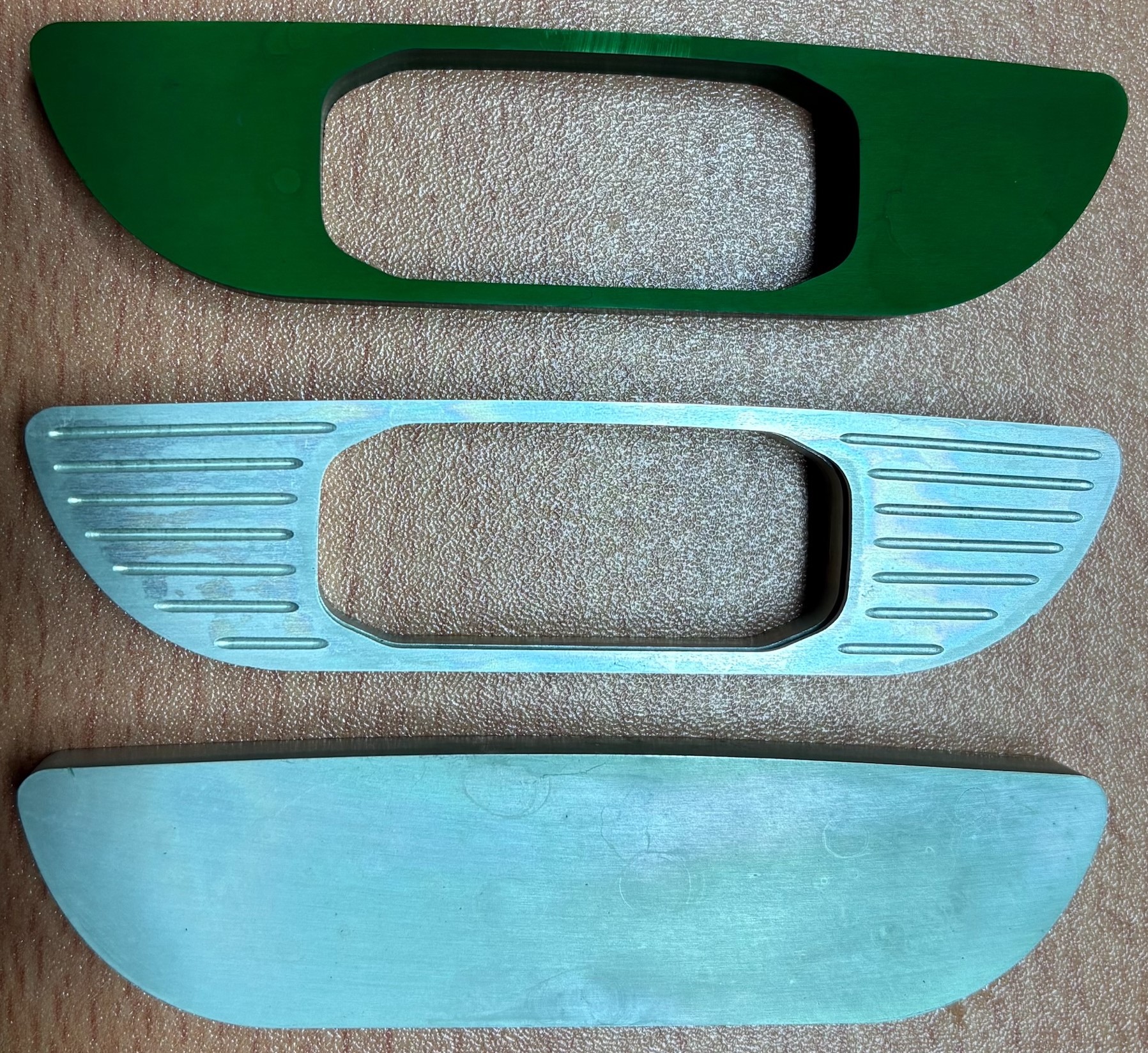Die Teile sind allesamt aus dem gleichen Rohling (AlMg3) gefräst und identisch behandelt. Die Oberfläche ist bei allen drei Teilen gleich geschliffen worden.